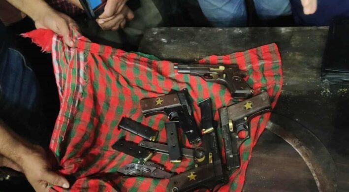 বাগেরহাটের মোল্লাহাটে চারটি বিদেশি পিস্তল, গুলি ও ম্যাগাজিনসহ ১১ জনকে আটক করেছে জেলা গোয়েন্দা পুলিশ (ডিবি)। বৃহস্পতিবার (২৬ জুন) সন্ধ্যায় উপজেলার ঢাকা-খুলনা মহাসড়কের মোল্লাহাট টোল প্লাজার সামনে একটি মাইক্রোবাস তল্লাশি চালিয়ে তাদের আটক করা হয়।