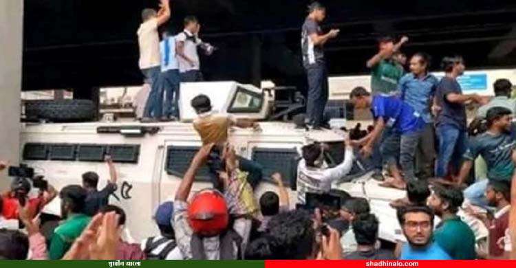 পরে তারা হোটেল ইন্টারকন্টিনেন্টালের দিকে অগ্রসর হতে থাকলে পুলিশের সিনিয়র কর্মকর্তারা ছাত্রদের বুঝিয়ে পুনরায় শাহবাগ মোড়ে ফিরিয়ে আনতে যায়। এ সময় বিএসএমএমইউয়ের পাশে নিরাপদ স্থানে রাখা এপিসি-২৫ ও ওয়াটার ক্যাননের চারদিকে ঘেরাও করে অনেক সংখ্যক আন্দোলনকারীরা উঠে নৃত্য শুরু করেন। তারা ওয়াটার ক্যানন চালককে গাড়ি থেকে জোর করে বের করার চেষ্টা ও গতিরোধ করেন। এর ফলে এপিসি ২৫ এর সামনের দুইটি এসএস স্ট্যান্ড, বনাটের উপরে বাম পাশে রেডিও অ্যান্টেনা এবং ডান পাশের পেছনের চাকার মার্টগার্ড চলি এবং ওয়াটার ক্যাননের বাম পাশের লুকিং গ্লাস ভেঙে অনুমানিক পাঁচ লাখ টাকার ক্ষয়ক্ষতি করেন। এ বিষয়ে শাহবাগ থানায় একটি সাধারণ ডায়েরি করা হয়। ছাত্রদের অন্যান্য সিনিয়র স্যাররা বুঝিয়ে এপিসি-২৫ ও ওয়াটার ক্যানন থেকে নামিয়ে আনেন এবং পরিস্থিতি শান্ত করার চেষ্টা করেন। কিন্তু তারা আরো ক্ষিপ্ত হয়ে পুলিশকে লক্ষ্য করে পানির বোতল, টেপটেনিস বল ও ইটের টুকরা ছুড়ে মারেন। এতে অনেক পুলিশ আঘাতপ্রাপ্ত হন।