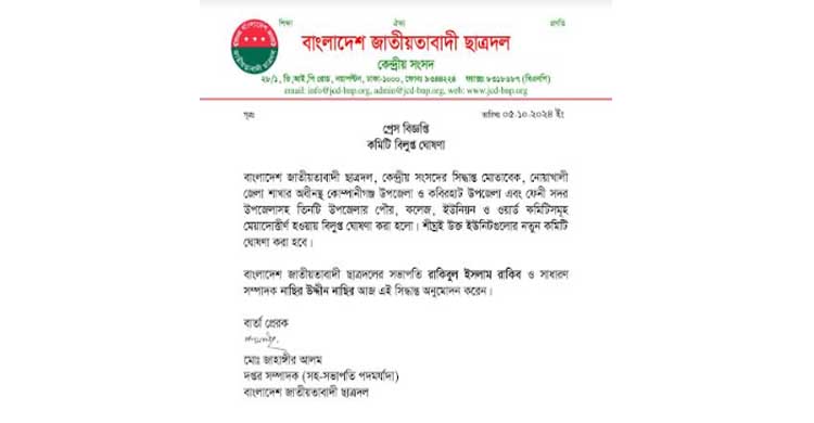 প্রেস বিজ্ঞপ্তিতে আরো বলা হয়েছে, নোয়াখালীর কোম্পানীগঞ্জ-কবিরহাট উপজেলা ছাত্রদলের কমিটি মেয়াদোত্তীর্ণ হওয়ায় কমিটি বিলুপ্ত ঘোষণা করা হয়। বাংলাদেশ জাতীয়তাবাদী ছাত্রদলের সভাপতি রকিবুল ইসলাম রাকিব ও সাধারণ সম্পাদক নাছির উদ্দীন নাছির এই সিদ্ধান্ত অনুমোদন করেন। শিগগিরই ইউনিটগুলোর নতুন কমিটি ঘোষণা করা হবে।
