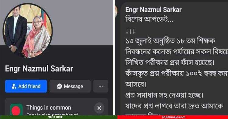 ইঞ্জিনিয়ার নাজমুল সরকার নামের ওই অ্যাকাউন্টের একটি পোস্টে লেখা হয়েছে, ‘১৩ জুলাই অনুষ্ঠিত ১৮তম শিক্ষক নিবন্ধনের কলেজ পর্যায়ের সব বিষয়ের লিখিত পরীক্ষার প্রশ্ন ফাঁস হয়েছে। ফাঁসকৃত প্রশ্ন পরীক্ষায় ১০০% হুবহু কমন আসবে। প্রশ্ন সমাধানসহ দেয়া হচ্ছে। যাদের প্রশ্ন লাগবে তারা দ্রুত আমাকে ম্যাসেজ দিন।