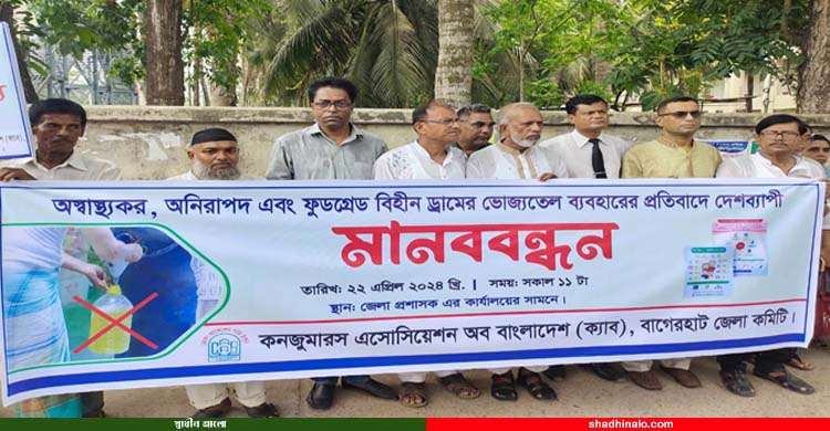 আজাদুল হক, বাগেরহাট: জেলার অস্বাস্থ্যকর, অনিরাপদ এবং ফুড গ্রেড বিহীন ড্রামের ভোজ্য তেল ব্যবহারের প্রতিবাদে বাগেরহাট জেলা কালেক্টরেটের সামনে মানববন্ধন কর্মসুচী পালন করা হয়েছে।