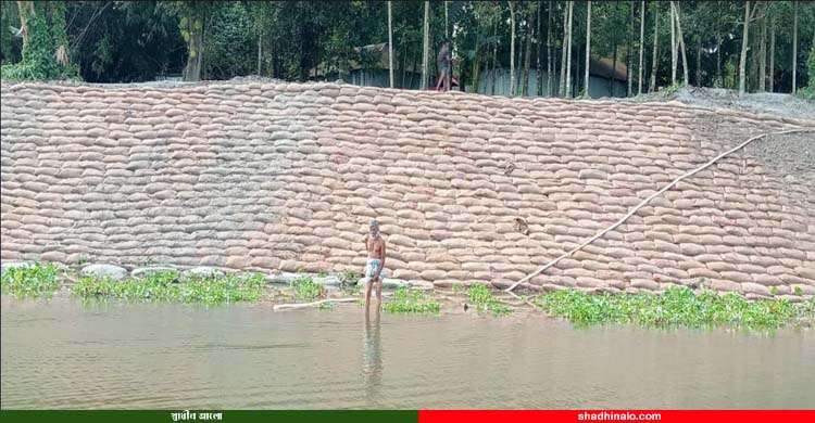 সরেজমিনে দেখা গেছে, প্রকল্প এলাকায় যেখানে জিও ব্যাগ ফেলা হয়েছে তার সাত-আট ফিটের মধ্যে অবৈধ ড্রেজার মেশিন দিয়ে গভীর করে বালু উঠানো হয়েছে। আবার ওই বালু দিয়ে ভর্তি করা হয়েছে জিও ব্যাগ। জিও ব্যাগে মোটা বালু দেয়ার নিয়ম থাকলেও চিকন বালু দেয়া হচ্ছে। জিও ব্যাগ ভর্তির বালু প্রায় চার লাখ ৭৪ হাজার ২৫০ কেজি ও গানি ব্যাগ ভর্তির জন্য তিন লাখ ১৯ হাজার ৫৮৩ কেজি বালুর মধ্যে শুধুমাত্র দুই ট্রলি বাহির হতে ক্রয় করা হয়েছে বলে স্থানীয়রা জানিয়েছেন। বাকি সমস্ত বালু নদী থেকে উঠানো হয়েছে বলে অভিযোগ করেছেন স্থানীয় আব্দুল জলিল ও আজিজুল ইসলামসহ একাধিক এলাকাবাসী।