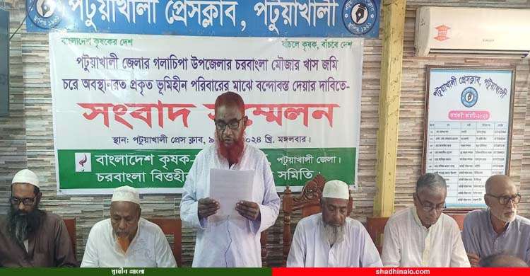 মঙ্গলবার ( ৯ জুলাই) পটুয়াখালী প্রেসক্লাবে পটুয়াখালী জেলা বাংলাদেশ কৃষক মজুর সংহতি ও চরবাংলা বিত্তহীন কৃষক সমবায় সমিতির আয়োজিত সংবাদ সম্মেলনে চরবাংলা মৌজার খাস জমি চরে অবস্থানরত প্রকৃত ভূমিহীন পরিবারের মাঝে বন্দোবস্ত দেয়ার দাবী জানিয়ে লিখিত বক্তব্য পাঠ করেন জেলা বাংলাদেশ কৃষক মজুর সংহতির সভাপতি এস এম আমজাদ হোসেন।