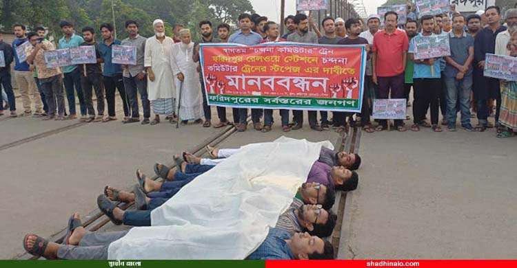 ফরিদপুরে কাফনের কাপড় পড়ে ট্রেন অবরোধ