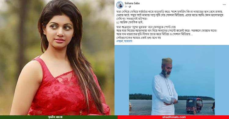এদিকে অভিনেত্রী সোহানা সাবা এক পোস্টে লিখেছেন, যারা দেখিয়ে দেখিয়ে ধর্মচর্চার নামে বাড়াবাড়ি করে, পাশে মসজিদ কিংবা নামাজের স্থান রেখে রাস্তায়, খেলার মাঠে, সমুদ্র তটে নামাজ পড়ে ছবি দেয় সোশাল মিডিয়ায়, এদের মাঝে আমি কোনো ভালো মানুষ দেখি না। সবগুলোই বাটপার। যারা শুক্রবার ‘জুম্মা মুবারক’ বলে ফেসবুকে পোস্ট দেয়, আর যারা নিজের আমলনামা বাদ দিয়ে অন্যদের পোস্টে কমেন্ট করে-পরকালে দোজখে যাবে!! আর দান খয়রাতের ছবি-হিসাব প্রচার করে মিডিয়া ও সোশ্যাল মিডিয়ায়। সেইগুলোকেও আমার একই ভণ্ড মনে হয়।