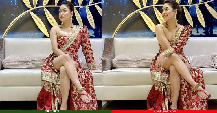 নতুন সংযোজনে হিসেবে সোনালি মেরুনের বেনারসি কাতান মিডিতে নিজেকে ছাড়িয়ে গেছেন যেন।