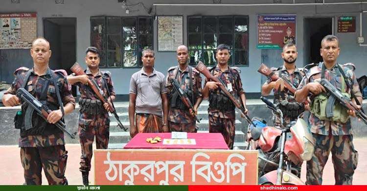 বুধবার (১০ জুলাই) উপজেলার ঠাকুরপুর সীমান্তের বাগানপাড়া এলাকা থেকে সোনার বারসহ ওই চোরাকারবারিকে আটক করা হয়।